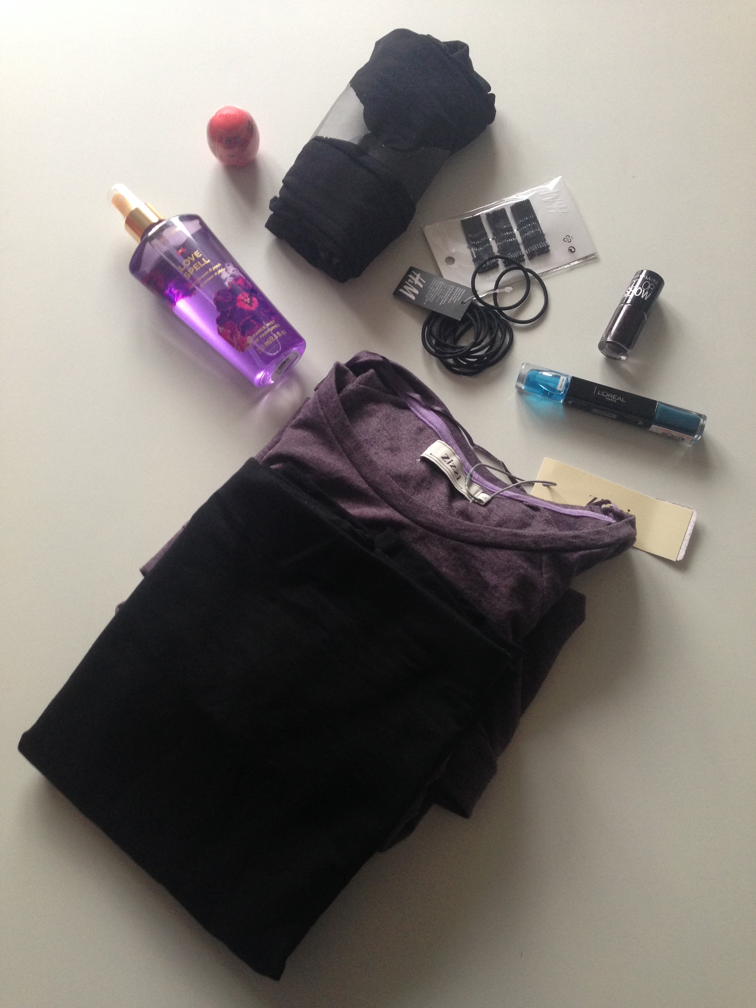 EOs lipbalm, Zizzi tights, Hair ties and grips from H&m, Victoria’s Secret Love Spell, Zizzi top, black Lindex skirt, Maybelline Color Show nailpolish in Burgundy Kiss and a new L’Oreal nailpolish in 007 Ocean Infini.